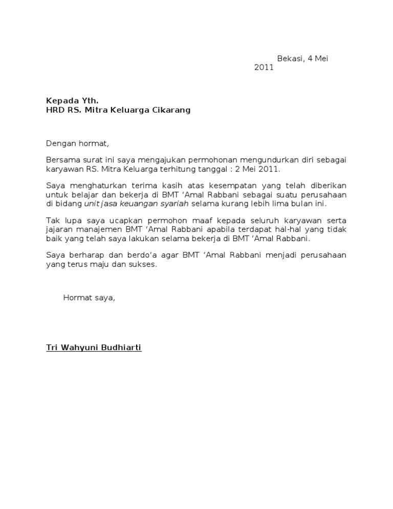 Surat ini juga bisa ditujukan untuk menyampaikan rasa terima kasih atas kesempatan bekerja yang diberikan oleh instansi atau perusahaan tersebut. Surat pengunduran diri merupakan sebuah surat yang dibuat dimana di dalam surat tersebut berisi informasi bahwa anda ingin resign atau mengundurkan diri dari jabatan yang anda emban selama anda bekerja di perusahaan tersebut. Damai abadi tentang kekaryawanan dan undangundang tenaga kerja maka saya dengan berat hati bermaksud untuk mengajukan pengunduran diri. Surat pengunduran diri kerja atau resign letter adalah surat pernyataan bahwa seseorang mengundurkan diri dari pekerjaannya dengan suatu alasan tertentu. Pantau terus informasi penting seputar properti lewat berita 99.co. Namun, tidak menutup kemungkinan dengan alasan. Seperti apa contoh surat mengundurkan diri yang baik dan benar agar tetap menjaga kesan baik di perusahaan. Berikut contoh surat pengunduran diri dari kerja dan organisasi (.doc). Contoh surat pengunduran diri kerja yang baik dan benar. Membuat surat pernyataan pengunduran diri merupakan salah satu cara resmi yang sangat dianjurkan bagi anda yang berniat keluar dari tempat kerja saat ini. Kumpulan contoh surat pengunduran diri 2021 (surat resign) kerja doc dan pdf beserta video tutorial cara buat surat. Berikut beberapa contoh surat pengunduran diri yang dapat anda jadikan pedoman dalam membuat surat pengunduran diri diatas merupakan salah satu dari contoh surat pengunduran diri dari pekerjaan. Contoh surat pengunduran diri doc (document/word/email), masukuniversitas.com.